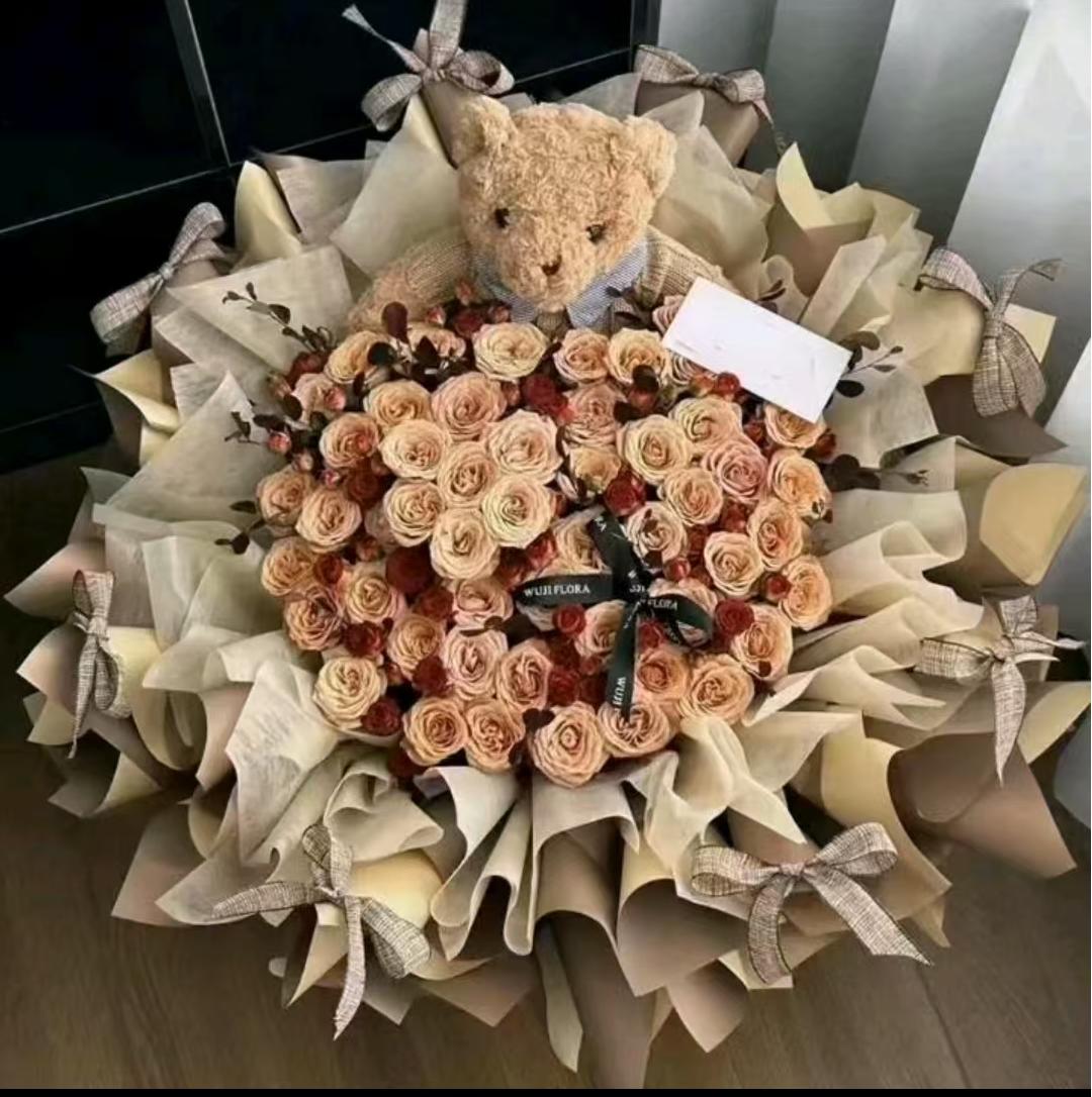 (小熊漫步)33朵卡布奇诺玫瑰混搭芭蕾风玩偶